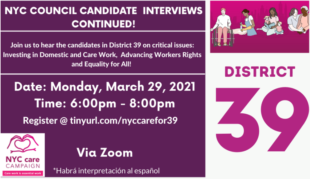 Last week our members turned out powerfully to ask District 39 City Council Candidates their stance on investment in the domestic work and care sector, and legislative proposals to advance workers’ rights, immigrant rights, and defunding the police! You can watch the recording of the interviews here and be sure to tune in where members will be interviewing three more candidates.