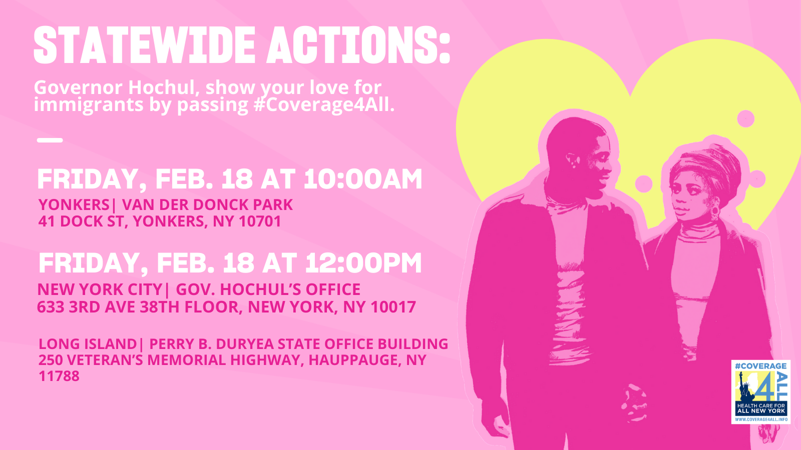 Please join us - Friday 2/18 - to make sure Gov. Hochul and the NYS Legislature see our support for #Coverage4All. We will start at 10:00 AM, with an action in Yonkers in Van Der Donck Park at 10:00 AM. Then #Coverage4All Coalition will rally at noon in front of Gov. Hochul's offices in Manhattan and Long Island asking her to show love for immigrants by passing #Coverage4All. As members of the Assembly and Senate meet to determine their priorities for the one house budgets this week, we will let them know that we want #Coverage4All this year. Please join the action that is closest to you!