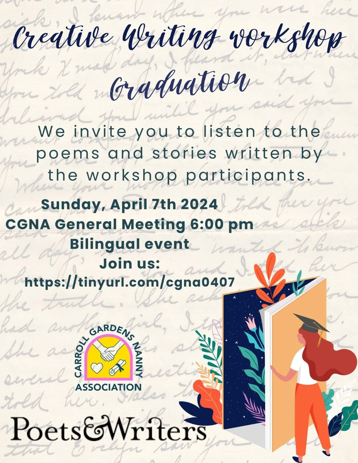 Back to All Events Creative Writing Workshop Graduation Sunday, April 7, 2024 6:00 PM 7:30 PM Google Calendar ICS