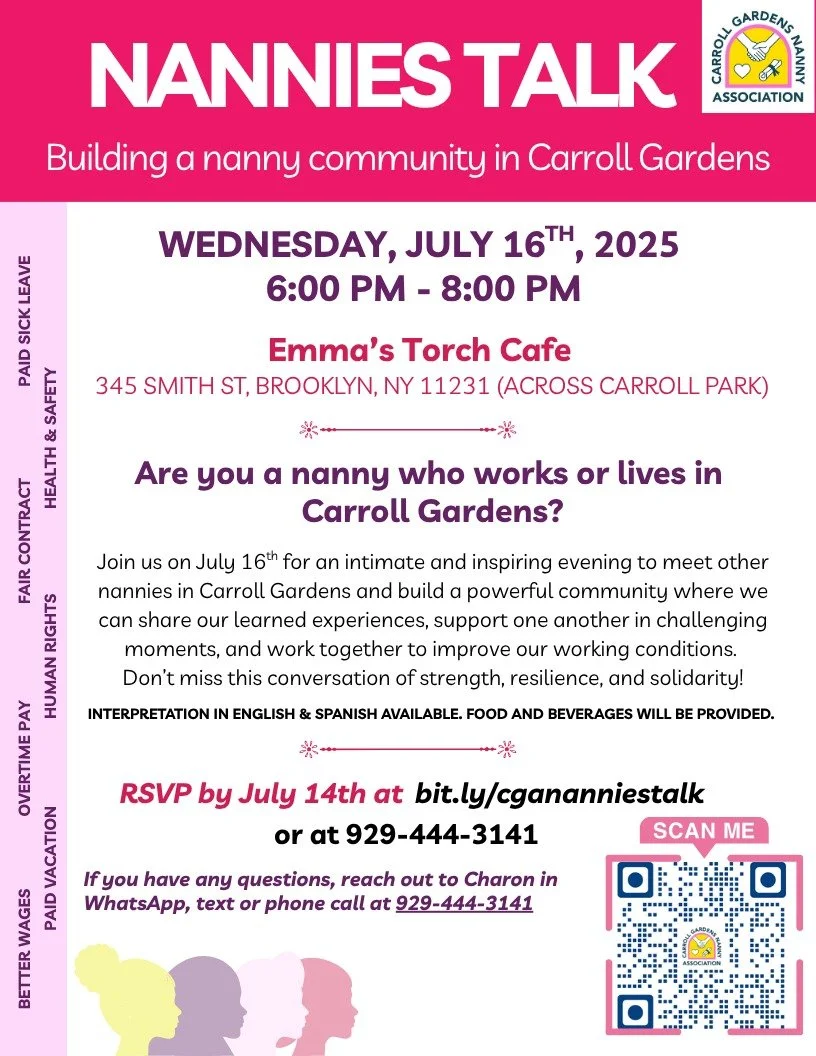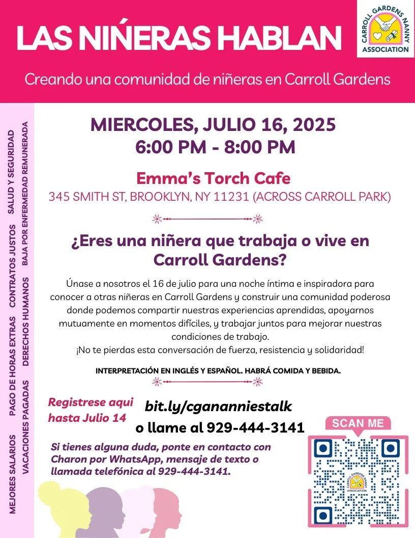 This special gathering is for nannies who live or work in Carroll Gardens. Come share your experiences, support one another in challenges, and help build a stronger, united community of domestic workers. Together, we’ll explore ways to improve our working conditions and raise our collective voice.