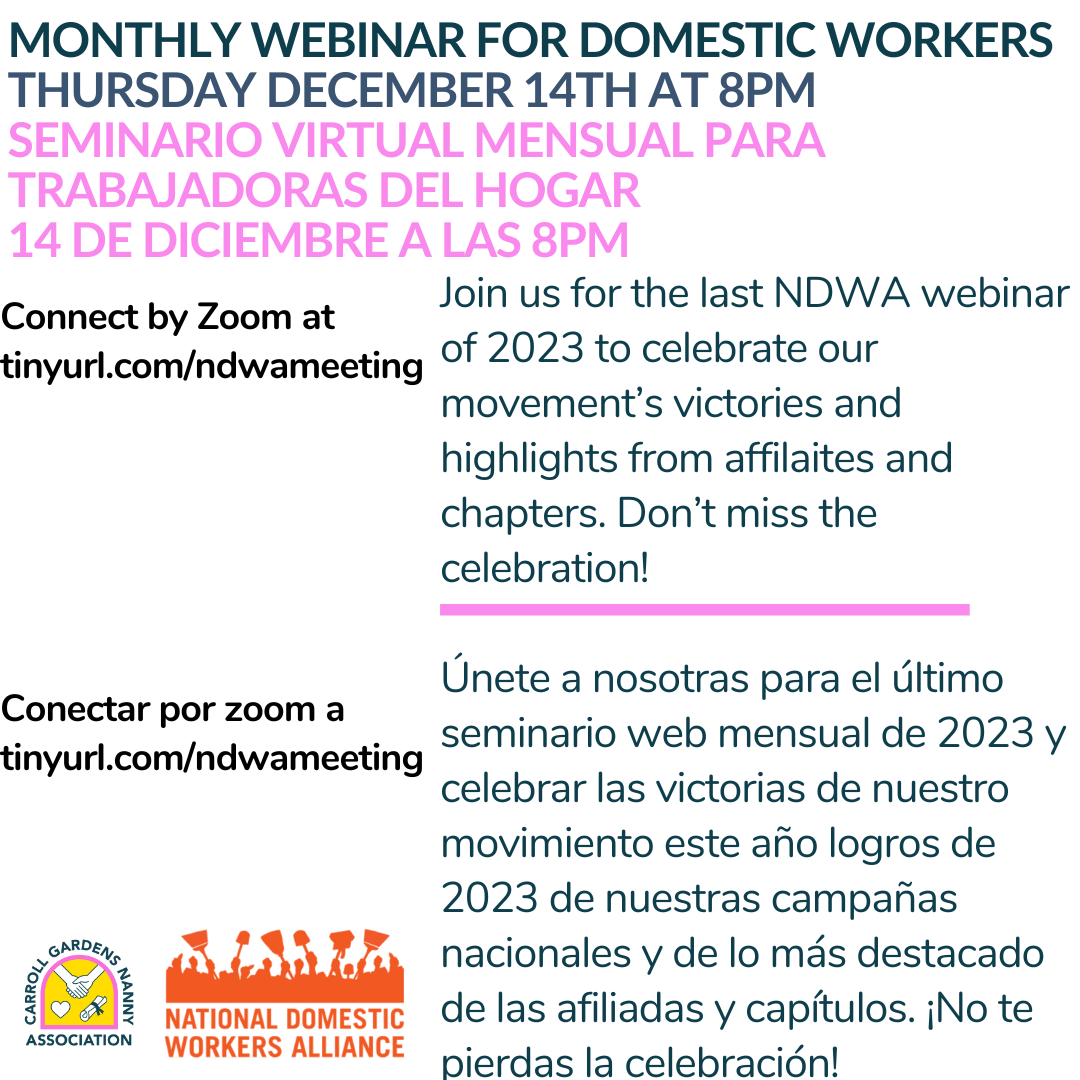 Back to All Events NDWA Monthly Webinar for Domestic Workers Thursday, December 14, 2023 8:00 PM 9:00 PM Google Calendar ICS Click Here to Connect!