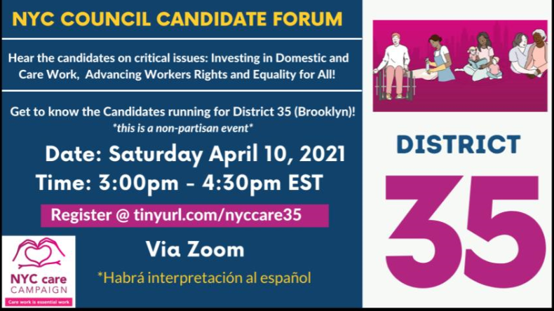 On Saturday, April 10th from 3:00pm to 4:30pm EST join NYC Care Campaign members and the Brooklyn 35 committee (Fort Greene, Clinton Hill, Crown Heights, Prospect Heights, Bed Stuy), for District 35 NYC Council Candidate forum to hear from the candidates about investing in domestic and care work, and legislative priorities to advance workers rights. Our main issues are: - Government investment in the domestic and care sector to create good quality jobs and make care accessible to all New Yorkers, so parents, older adults, and people with disabilities have the care and support they need at home - Advancing equality by passing anti-discriminatory and labor laws to protect low-wage workers, in particular immigrant Black, Indigenous, and women of color (BIWOC). The NYC Care Campaign is a growing coalition of domestic workers, employers, parents, families, caregivers, older adults, and people with disabilities working together to transform New York City’s care economy into one that is just, equitable and sustainable for all. The campaign is led by the National Domestic Workers Alliance, Hand in Hand: The Domestic Employers Network, Adhikaar, Carroll Gardens Association. Some of the endorser organizations are Jews for Racial and Economic Justice, Innovative Youth Care, among other local groups