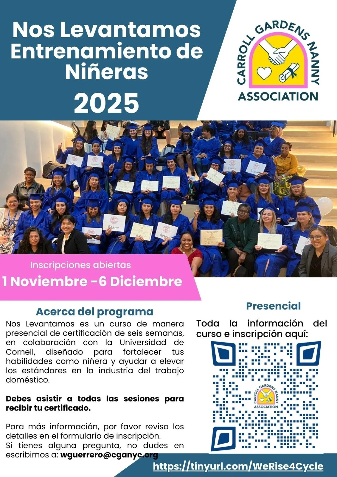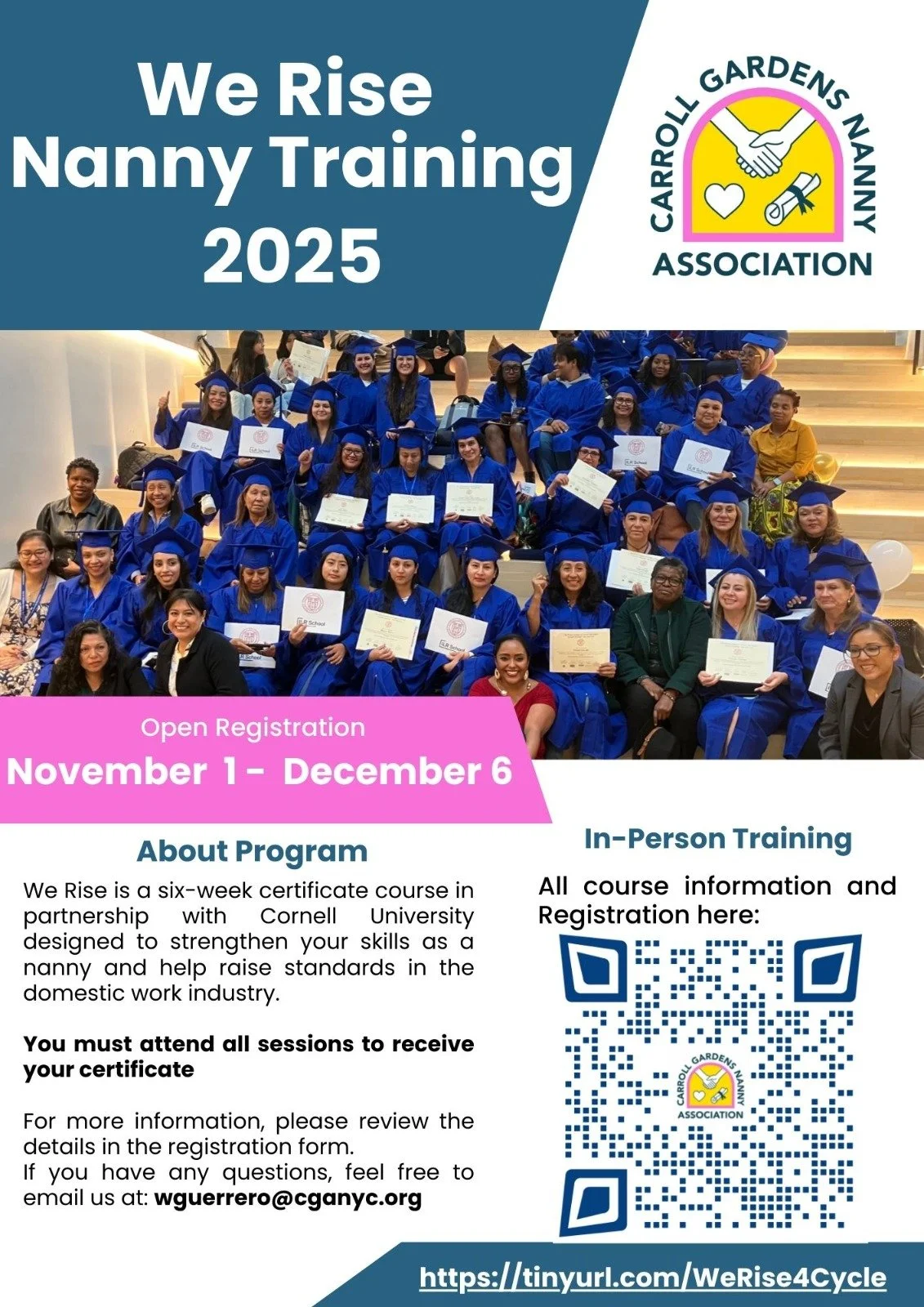 Welcome to We Rise! We Rise is a six-week certificate course in partnership with Cornell University to improve your skills as a nanny and raise standards in the domestic work industry. The training will begin on Saturday, November 1st and end on Saturday, December 6th with a schedule of 10:00 am - 5:00 pm. and cover the following topics: